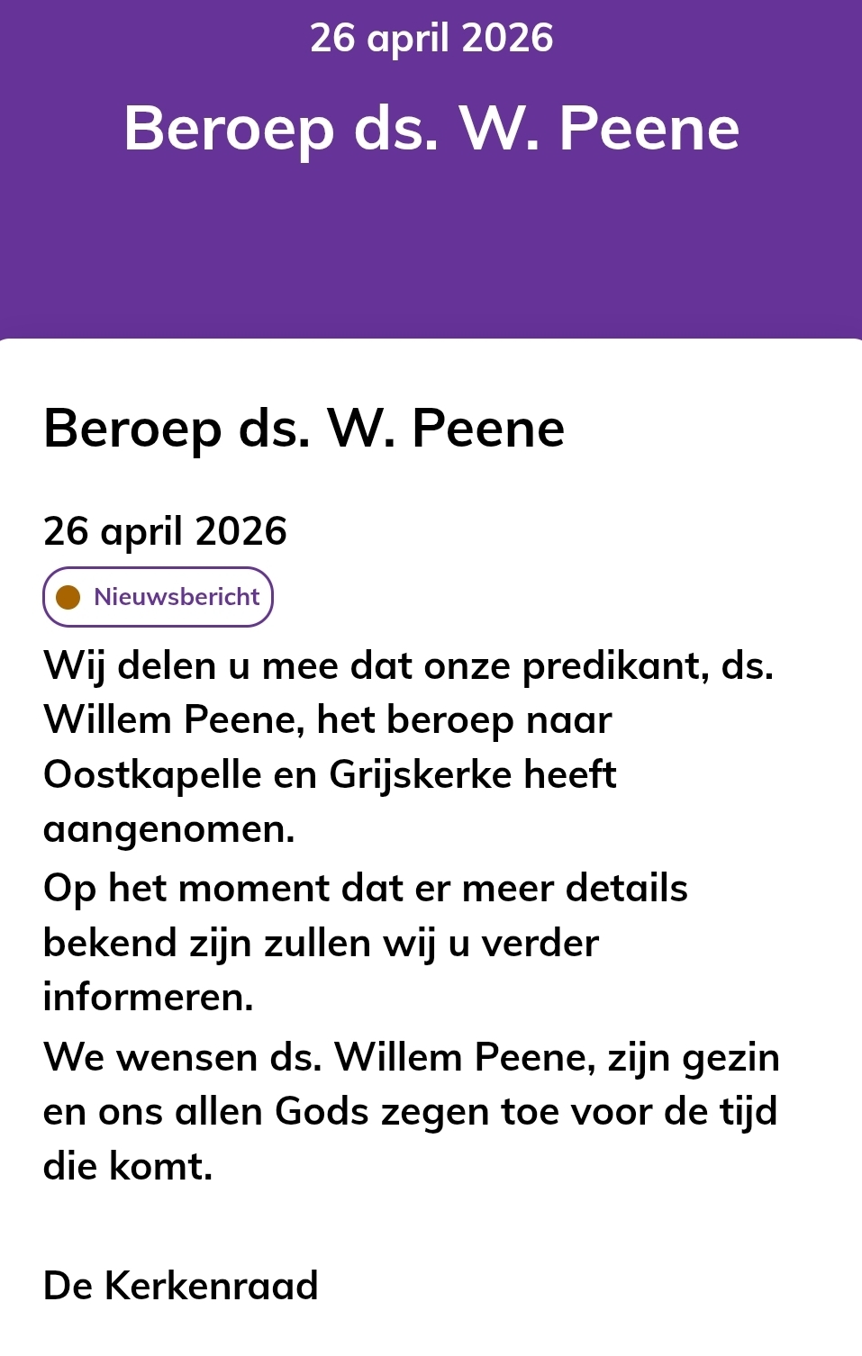 Ds Willem Peene neemt beroep aan Ds Willem Peene neemt beroep aan