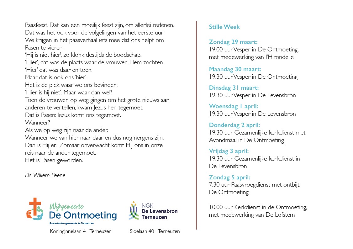 23 mrt 2026 Paasontbijt Op Paasmorgen is er om 7u30 de paasvroegdienst. Samen vieren we de opstanding van onze Heer. Daarna kan je om 8u15 aanschuiven bij het paasontbijt. Hiervoor graag opgeven bij Corrie Simons 06-57648399 of Tamara Platteeuw 06-53490947. De ervaring leert dat er altijd genoeg is, dus je kunt ook komen als je je niet hebt opgegeven. Je kan natuurlijk ook naar 1 van biede komen. |