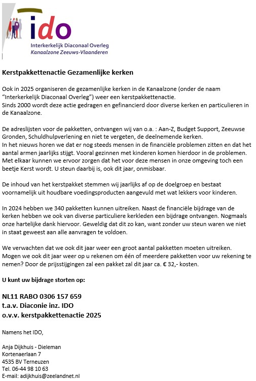 06 dec 2025 Kerstpakketten IDO U kunt uw bijdrage storten op: NL11 RABO 0306 157 659 t.a.v. Diaconie inz. IDO o.v.v. kerstpakkettenactie 2025
